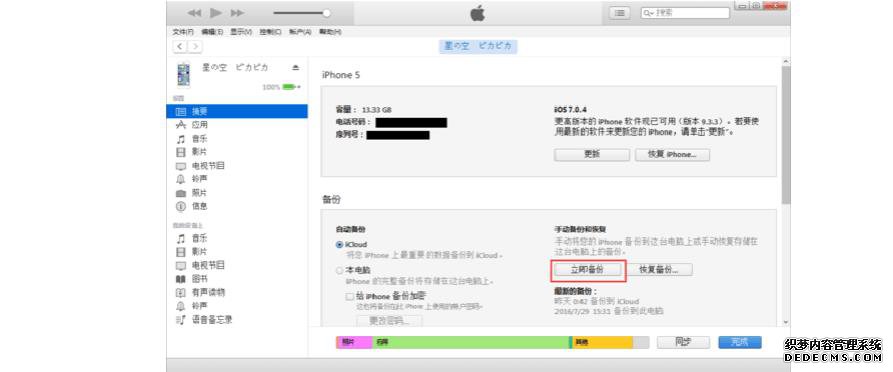 接下来,在计算机上安装并打开iTunes软件,单击上方的小苹果电话图标,在下面选择“此计算机”,然后单击“立即备份”按钮。