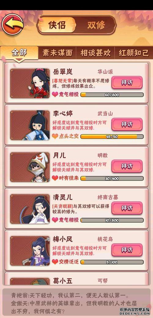 首先,玩家必须参加相应的武术才能“互相认识”。之后,他们通过几种方式(基本上是花钱)来磨练自己的情绪。离开武术后,他们可以访问“熊甲”界面,但必须先见面再见面。